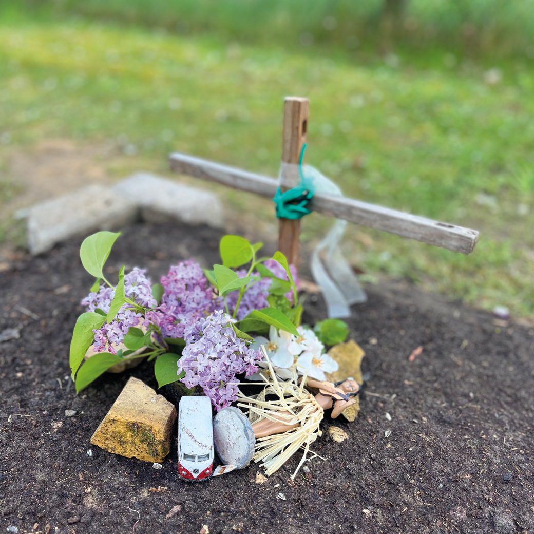 Anfangs mag ich die sandige Erde nicht auf seinen Kopf werfen und lege sie nur ganz vorsichtig drumherum. Meine Söhne bekommen das mit und helfen mir. Sie bedeckten seinen Kopf vorsichtig mit Erde, dann kann auch ich weiter machen. Als wir fertig sind lege ich meine Wackel-Hula-Dame und ein Spielzeug Bulli, beides Dinge aus Bo, auf die frisch aufgehäufte Erde.